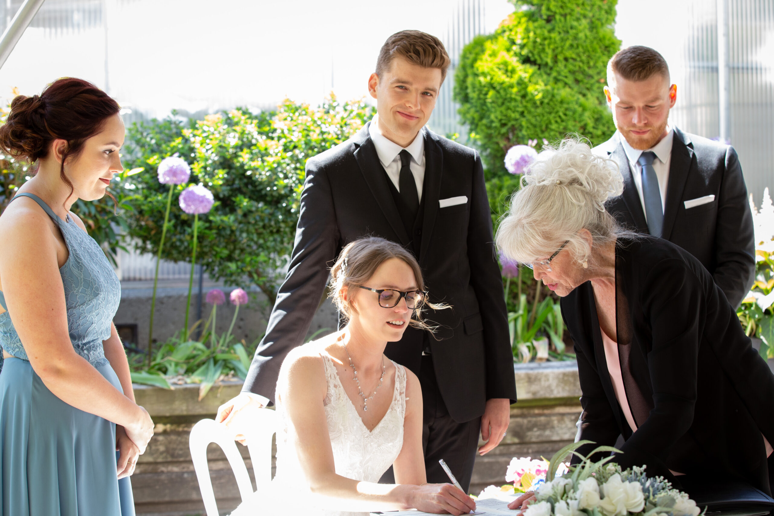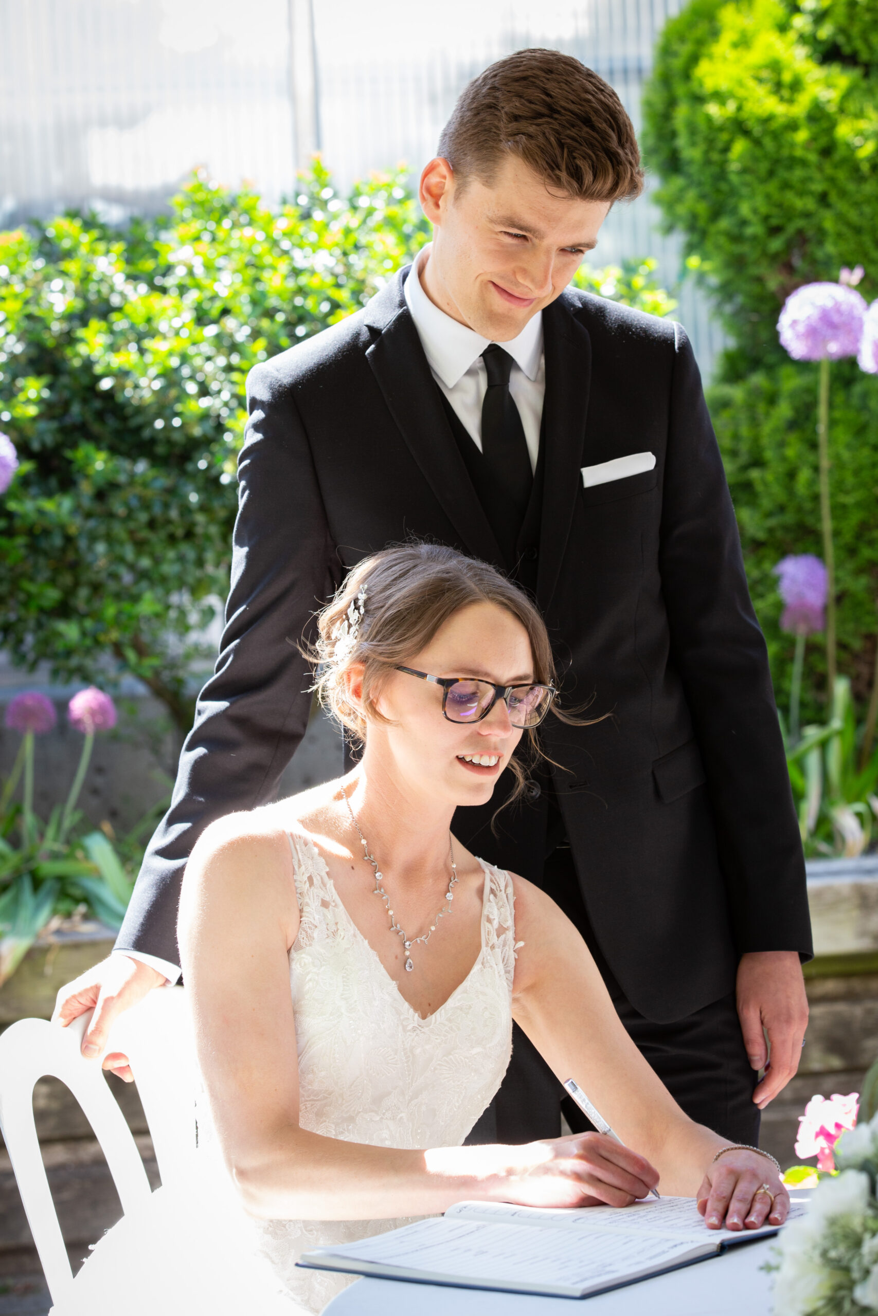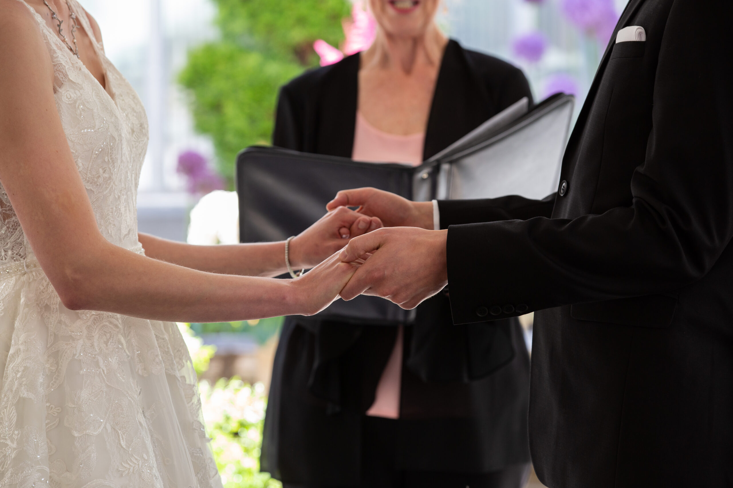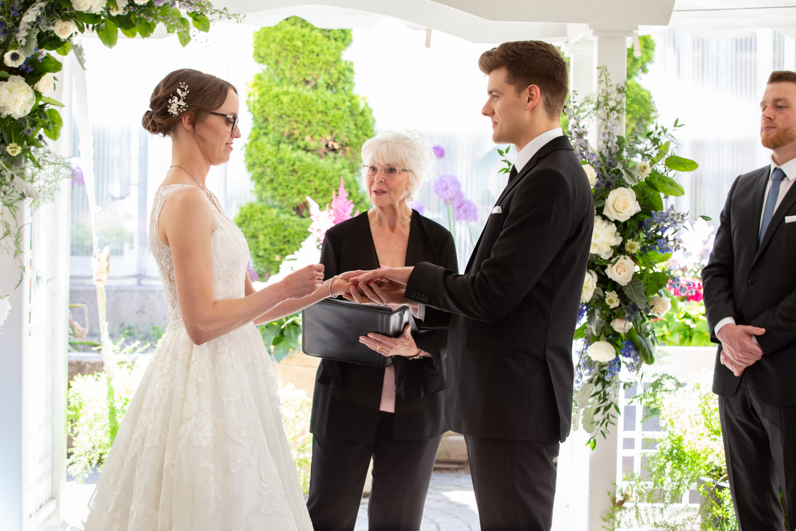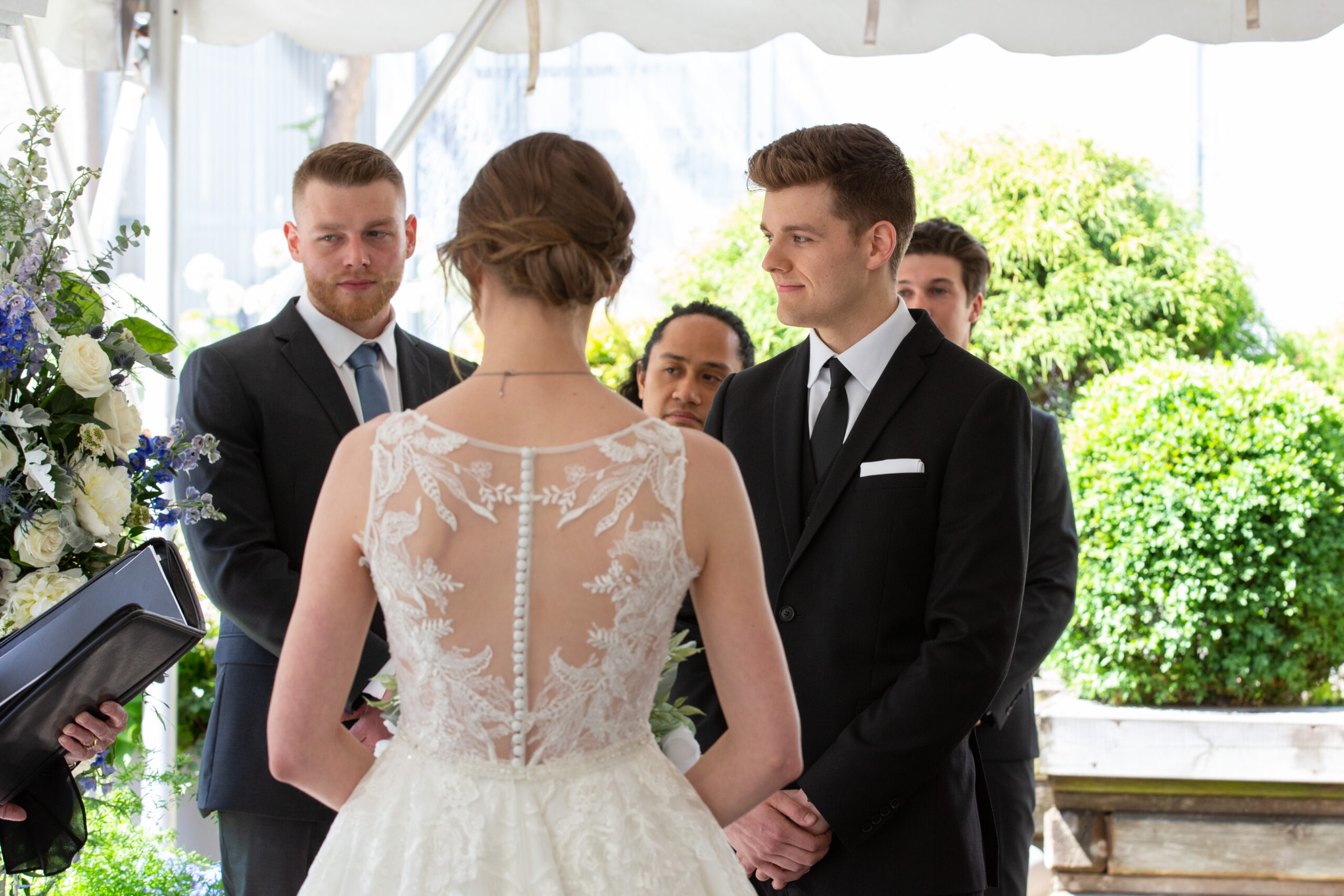The ceremony was intimate, surrounded by the couple’s closest friends and family. Sarah’s smile lit up the garden path as she made her way toward Max, who was visibly moved seeing her for the first time. The summer blooms around them seemed to celebrate right along with the guests, echoing the couple’s joy with every color and petal.